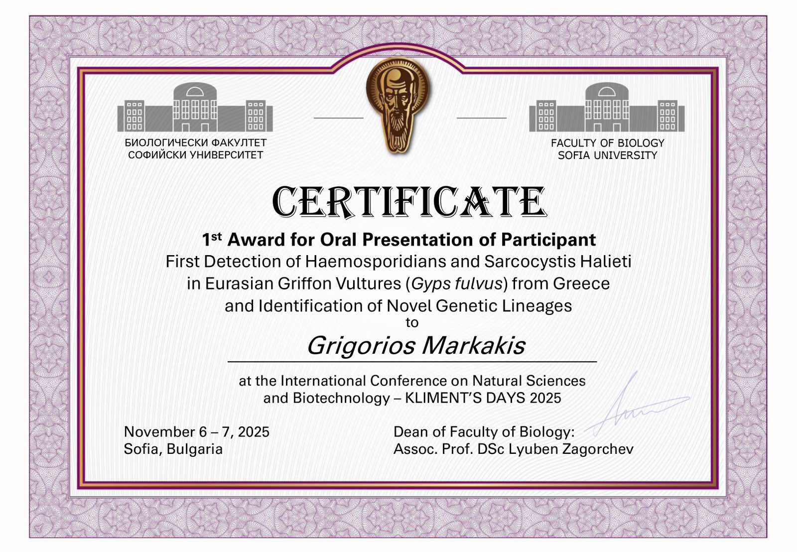 Λίγες ημέρες αργότερα, ο ίδιος συμμετείχε στο International Conference on Natural Sciences & Biotechnology, που διεξήχθη στη Σόφια (6-7/11/25), όπου η ομιλία του απέσπασε το πρώτο βραβείο του συνεδρίου.