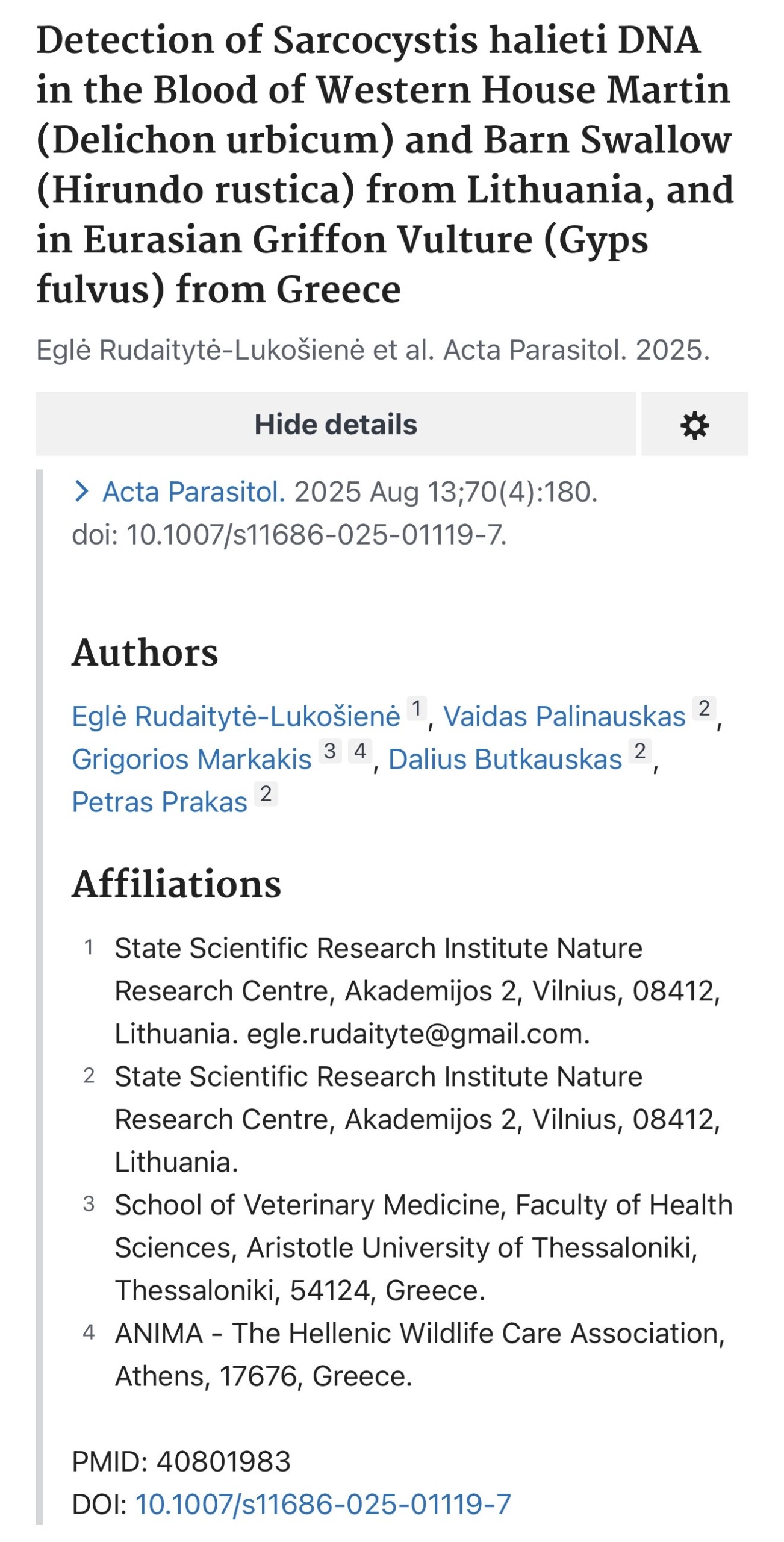 Η μελέτη αφορούσε άγρια πτηνά της Ελλάδας και της Λιθουανίας και διερεύνησε την παρουσία σε αυτά του παρασίτου Sarcocystis spp. μέσω ανάλυσης DNA από το αίμα τους. Η Sarcocystis spp. είναι κοκκίδιο παράσιτο που σχηματίζει κύστες στο μυϊκό ιστό πολλών θηλαστικών, πτηνών και ερπετών και η διάγνωσή του κανονικά απαιτεί εξέταση μυικού ιστού του ξενιστή. Στην έρευνά μας ανιχνεύθηκε Sarcocystis halieti σε 9 από τα 93 δείγματα (στο 17.4% των όρνιων της Ελλάδας και στο 7.5% και 6.7% των σταβλοχελίδονων και σπιτοχελίδονων της Λιθουανίας, αντίστοιχα).